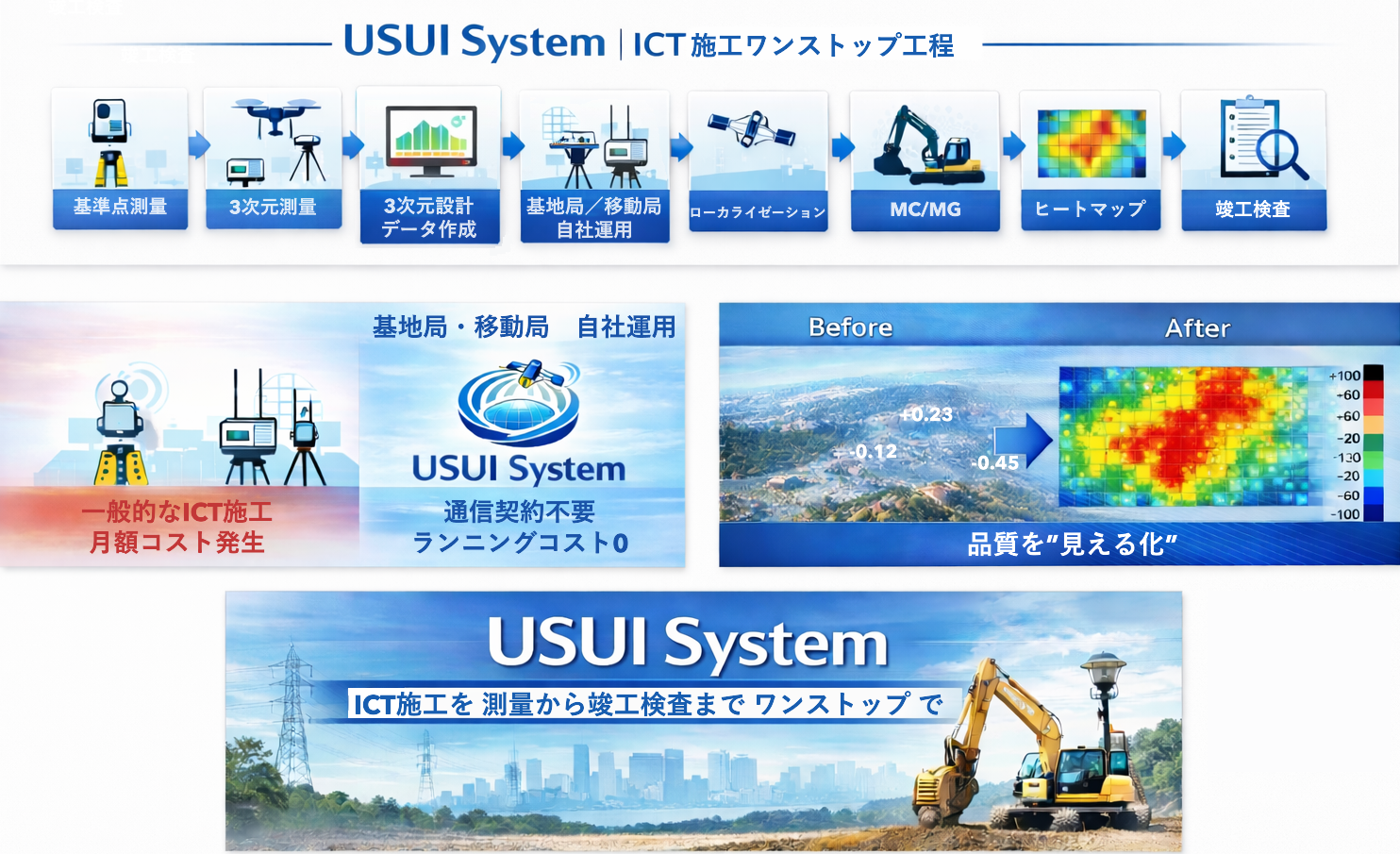 ICT建機の精度確認、ヒートマップ作成、出来形・竣工検査までワンストップで対応します。
